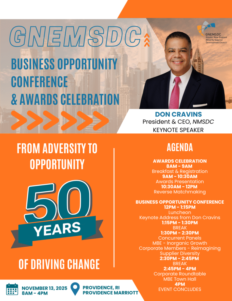 « All Events 2025 Annual Awards Celebration & Business Opportunity Conference November 13 @ 8:00 am - 4:00 pm « How to Do Business with Skanska Corporate Member Industry Group Meeting – Q4 » Add to calendar Google Calendar iCalendar Outlook 365 Outlook Live Details Date: November 13 Time: 8:00 am - 4:00 pm Website: https://www.eventbrite.com/e/gnemsdc-2025-business-opportunity-conference-awards-celebration-tickets-1557490749759?aff=oddtdtcreator